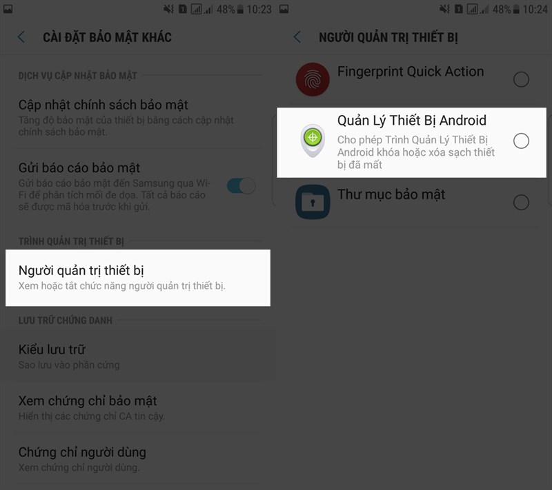 Trình quản lý thiết bị là một công cụ rất hữu ích của Google giúp bạn có thể theo dõi điện thoại, đổ chuông, gửi vị trí hoặc xoá nội dung trên smartphone từ xa. Vào Cài đặt => Bảo mật => Quản trị viên thiết bị
